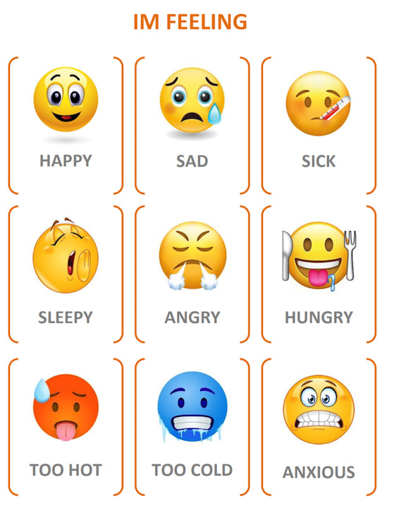 I’M FEELING (Orange) – 9 clear mood icons: Happy, Sad, Angry, Sleepy, Hungry, Sick, Too Hot, Too Cold, and Anxious.